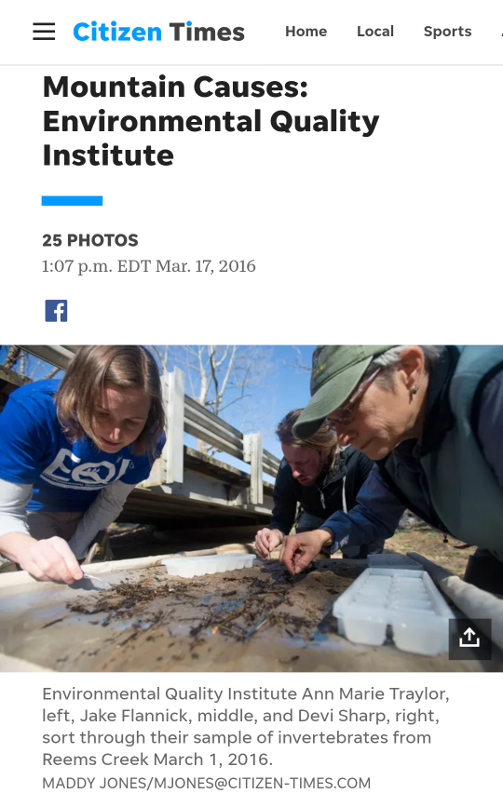 This collection of maps was created for The Environmental Quality Institute (EQI) to supplement their annual water quality report. Each month volunteer citizen-scientists collect water samples at specific sites along streams and waterways in Western North Carolina. This is known as the Volunteer Water Information Network (VWIN) project. Sampling locations are strategically placed in key areas in an attempt to fully capture an understanding of water quality in the watershed. Some locations have been sampled for over twenty-five years. These samples are returned to the EQI Lab to be analyzed for eight chemical parameters. After three years of sampling, a water quality rating can be derived.