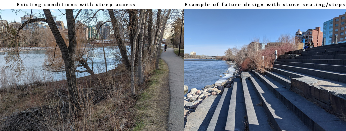As of May 2021, the Sunnyside Flood Barrier is still under design and the inclusion of these community-generated is not yet secured. The Sunnyside Brightening Committee will continue engaging with the City of Calgary Water Resources and Parks, as well as City Council and community members. We believe that this barrier redesign provides a once in a lifetime project that will impact Sunnysiders and thousands of visitors every day. We’re confident that together we can produce a beautiful, ecologically beneficial greenway. If you’d like to join us, please email me at welkerpd@gmail.com.For more details, check out this pdf of our ideas: SBC’s Vision for the Bow River Pathway.pdf